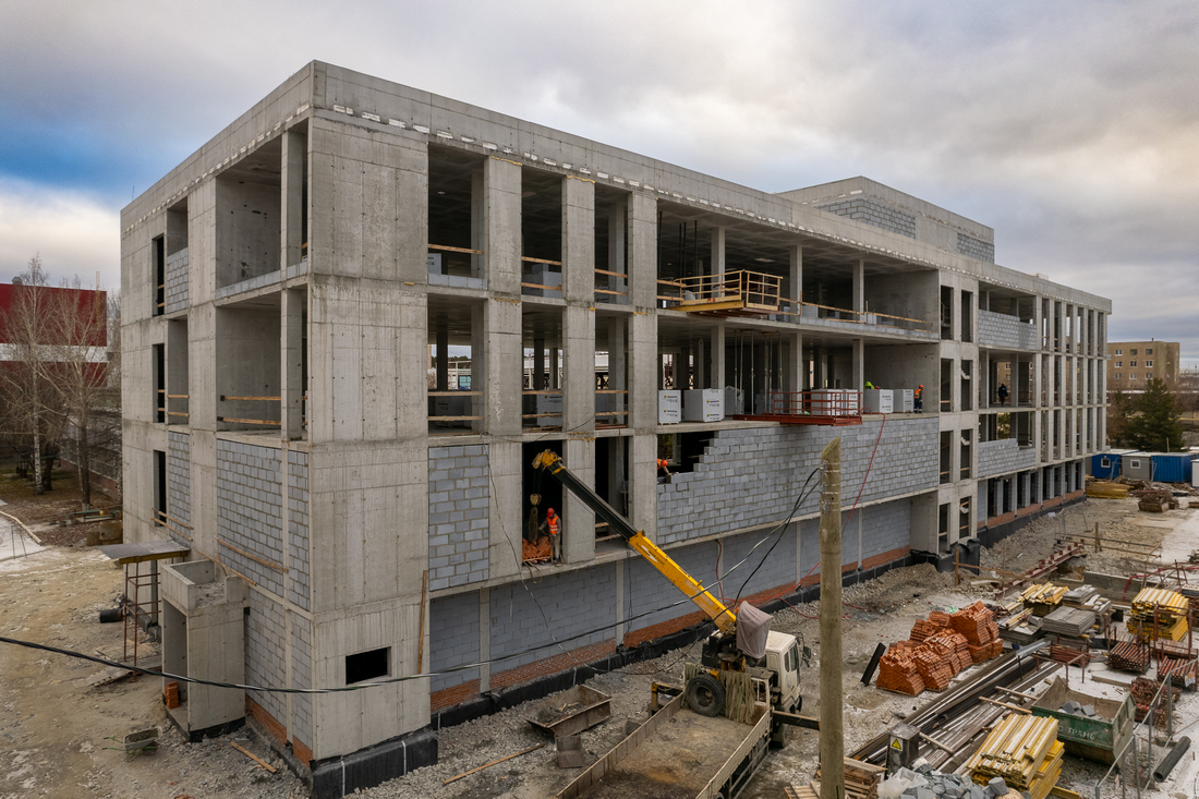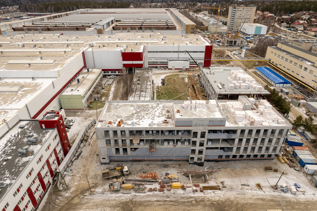 Здание соединено переходами с существующим цехом и строящимся испытательным центром.