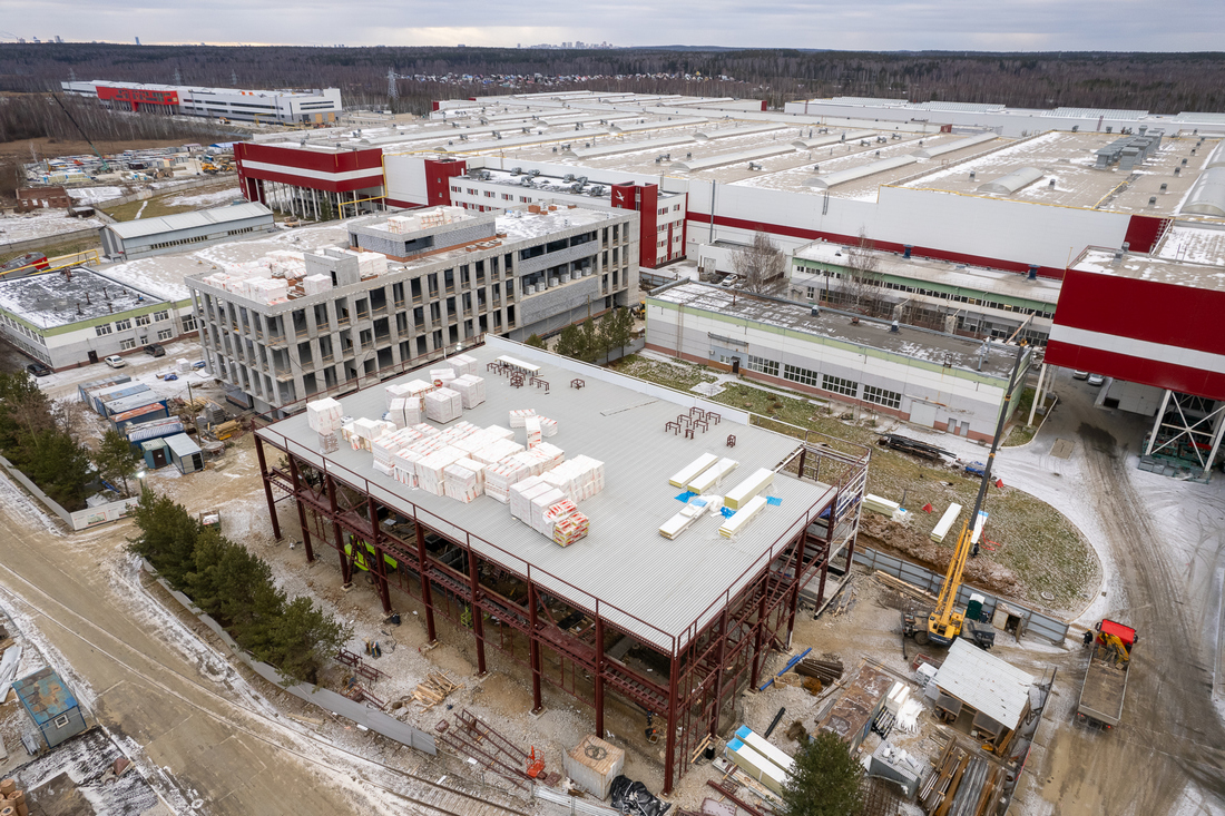 Здание соединено переходами с существующим цехом и строящимся испытательным центром.